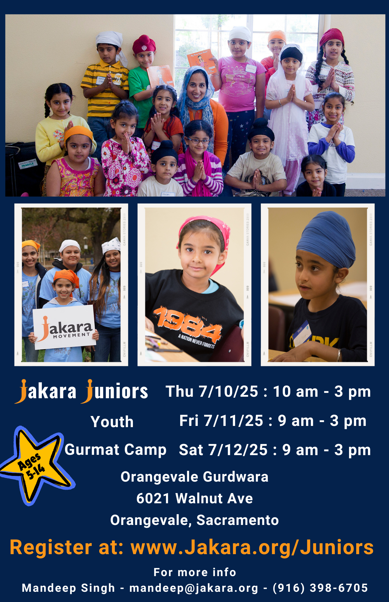 Thank you for your interest in our Jakara Juniors Sikh Youth Camp. This summer, we will be hosting the first day of Guru Maneyo Granth Gurdwara Sahib in Orangevale's 3 day camp. The Jakara Juniors will be held on Thursday July 10th from 10 am to 3 pm. The Gurdwara's Gurmat Camp will be held on Friday July 11th and Saturday Jully 12th from 9 am to 3 pm.